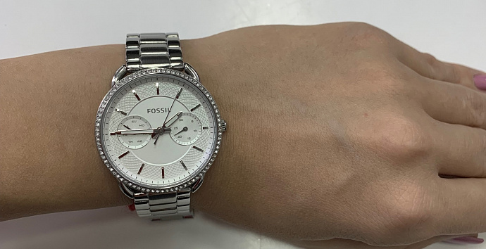 Корпус и браслет модели из нержавеющей стали, безель усыпан кристаллами, на перламутровом циферблате расположены два дополнительных окошка с окошком с днем недели и текущей датой.