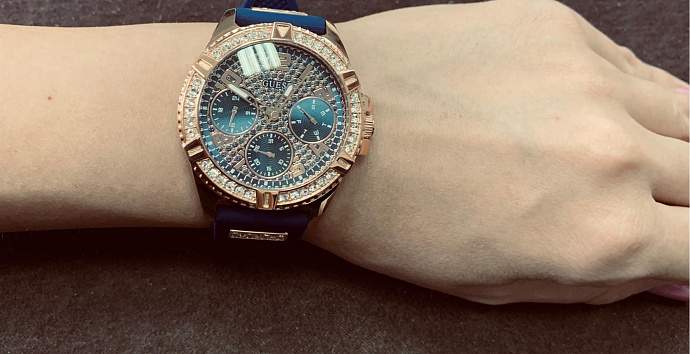 На циферблате расположены три дополнительных окошка, с текущей датой, днем недели и форматом времени 12/24 часа